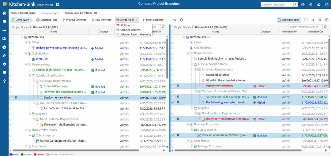 TopTeam branches the full picture. Every requirement, test case, trace link, diagram, and risk is versioned together—so each branch is a truly independent, fully traceable variant. Whether you're evolving a component, developing a customer-specific version, or pursuing parallel features, TopTeam ensures you don’t lose the "why" behind the "what."