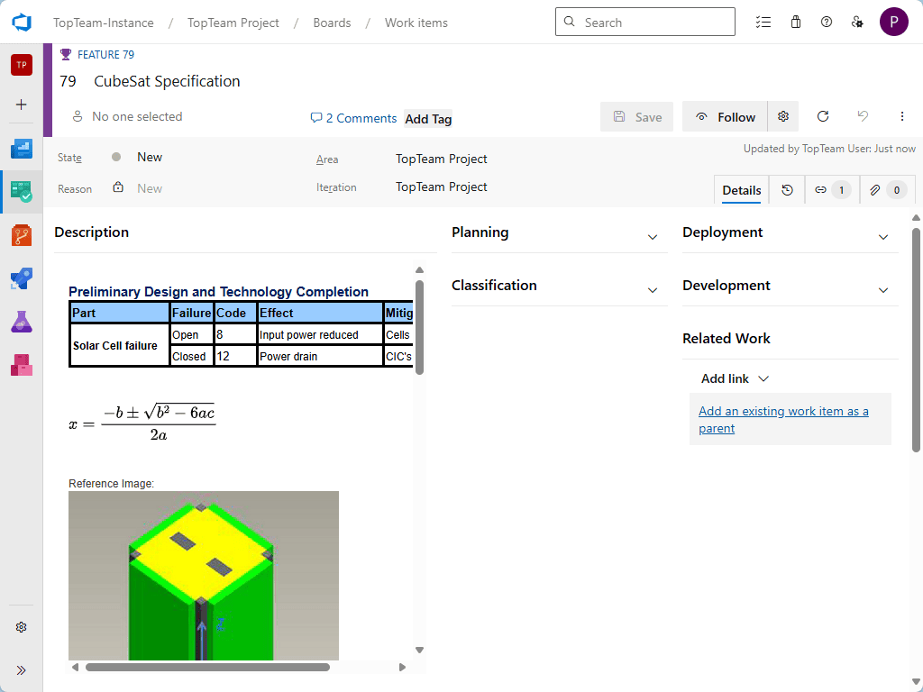 In TopTeam: Author rich user stories and requirements. Add wireframes, mockups, and diagrams. Link compliance requirements. Create test cases.